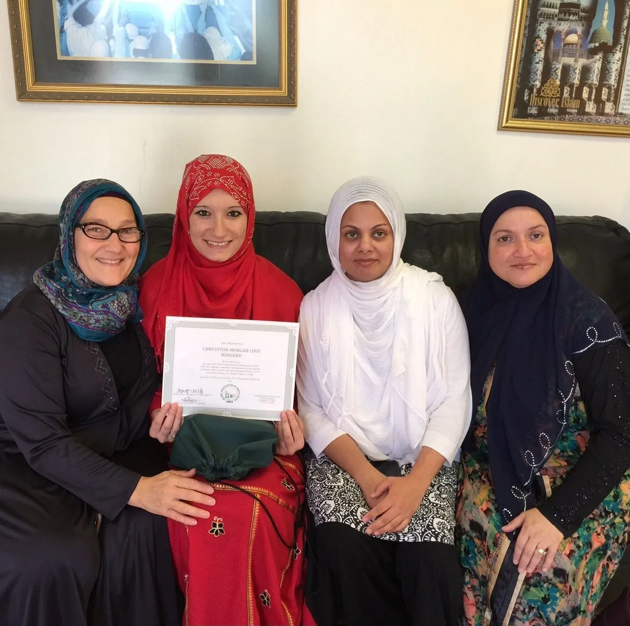 Chryston becomes Muslim, and shows her Shahada certificate in this image.